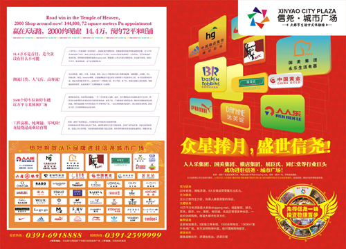 信堯·城市廣場(chǎng),是河南信堯集團(tuán)20年商業(yè)成功運(yùn)作砥礪后又一具有劃時(shí)代意義的城市商業(yè)shopping mall。創(chuàng)新規(guī)劃,引入深圳萬(wàn)象城的領(lǐng)先設(shè)計(jì),采用層層主力店,專屬停車樓,萬(wàn)平方米休閑廣場(chǎng),全鋼架結(jié)構(gòu)等多重優(yōu)勢(shì),史無前例的引入了人人樂超市,國(guó)美電器,橫店影城,屈臣氏,北京同仁堂,肯德基等國(guó)際國(guó)內(nèi)一線上市公司進(jìn)駐,引領(lǐng)了一個(gè)城市的消費(fèi)人潮和投資熱潮,開啟濟(jì)源市全新的商業(yè)經(jīng)營(yíng)和運(yùn)營(yíng)模式!