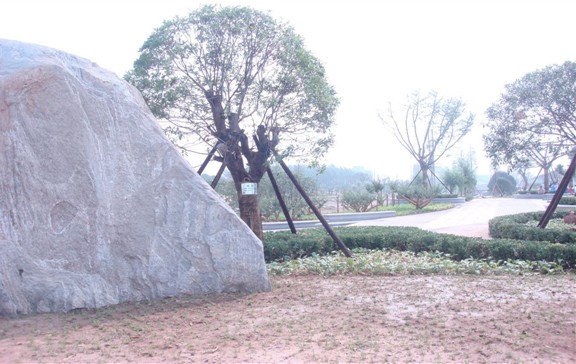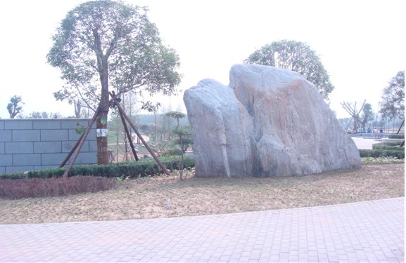 景觀石與桂樹(shù)雕塑景觀墻相輔相成