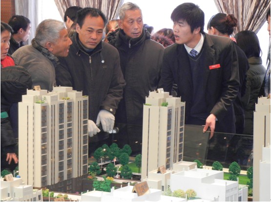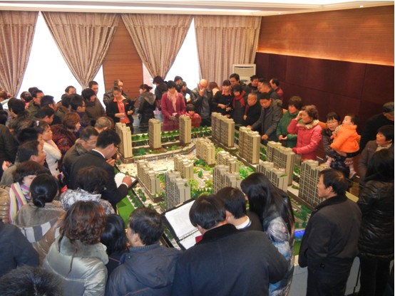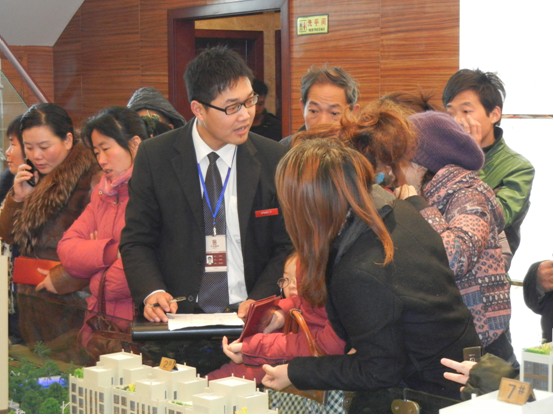 置業(yè)顧問在沙盤周圍解答客戶疑問,客戶圍滿了沙盤周圍,每個(gè)職業(yè)顧問都應(yīng)接不暇。