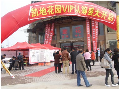 10月20日上午7時許,筆者趕赴凱地花園售樓中心,之間彩虹門、帳篷、桌椅、板凳均已擺設(shè)到位,現(xiàn)場已聚集了數(shù)十位客戶。據(jù)現(xiàn)場負責人張經(jīng)理介紹,認籌開始前一晚,所有工作人員已經(jīng)加班將所有現(xiàn)場設(shè)施搭設(shè)完成,凌晨便有客戶前來等候?!翱蛻舻闹С?,讓我們動力十足”,張經(jīng)理如是說。筆者注意到,工作人員還細心的為客戶準備了早餐和瓜子花生,打發(fā)等待時間。
