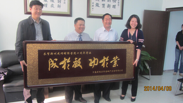 河南省尚正行房地產(chǎn)咨詢有限公司有幸與合作伙伴鄭州成功財(cái)經(jīng)學(xué)院共同慶祝成立十周年,和成功學(xué)院合作五年來,學(xué)院每年都為我司輸送幾十名優(yōu)秀人才,至此已經(jīng)有近百名成功學(xué)院學(xué)子在我司任職,其中擔(dān)任公司要職的也大有人在,介于與成功學(xué)院的友好合作,在成功學(xué)院舉行十周年慶之際,我司代表副總王宏偉,人事總監(jiān)凌云英及成功學(xué)院在我司代表一行前往學(xué)院祝賀,并送去我司對(duì)學(xué)院的美好祝愿以及感謝,希望學(xué)院宏圖大展、越辦越好,也希望我們的合作能夠繼續(xù)順利,共同為社會(huì)作出自己的貢獻(xiàn)!