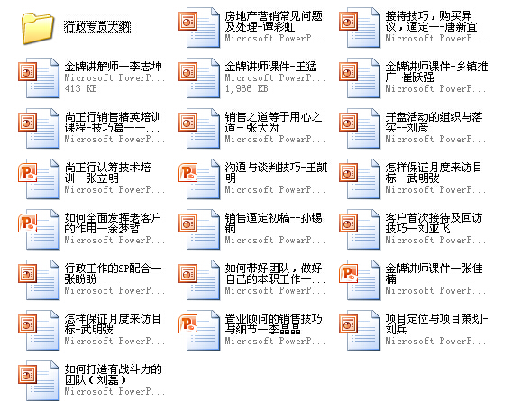 在首批次的金牌講師課件中,其所培訓(xùn)的對(duì)象涵蓋了置業(yè)顧問、案場(chǎng)主管、案場(chǎng)經(jīng)理、行政專員以及推廣專員等崗位。預(yù)期案場(chǎng)各個(gè)崗位的優(yōu)秀員工,屆時(shí)均可以獲得相關(guān)專業(yè)知識(shí)的培訓(xùn)。其中,部分員工的培訓(xùn)課題如下圖所示: