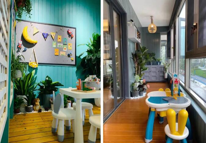 雙蕊:它的陽臺(tái)基本上都是連接著客廳還有臥室,至少是兩個(gè)空間都連接了陽臺(tái),整個(gè)陽臺(tái)下來,它的面寬大概到十幾米,其實(shí)它這個(gè)陽臺(tái)我比較喜歡的是,它是北向和南向都有陽臺(tái),北邊的陽臺(tái),比如說家里邊平常洗個(gè)衣服,放個(gè)洗衣機(jī)可以放北邊,雜物也可以放北邊。南邊的話就完全用于個(gè)人生活,比如說家里邊比較有情調(diào)的你可以在南陽臺(tái)做個(gè)小花園,種個(gè)小花小草的;有孩子的話,你可以做兒童平常游樂的地方,放一些玩具、讀書,做讀書角。直接把玩具柜做到墻上,玩完了往柜子里一放。這樣客廳也可以保持整潔。