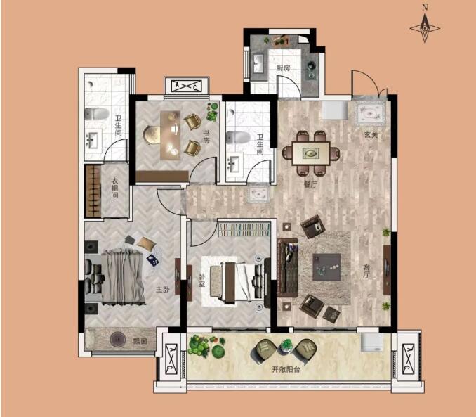 ②南北雙陽臺(tái),修身養(yǎng)性區(qū),家政區(qū)、健身區(qū),雜物放置區(qū),滿足家人不同需求;